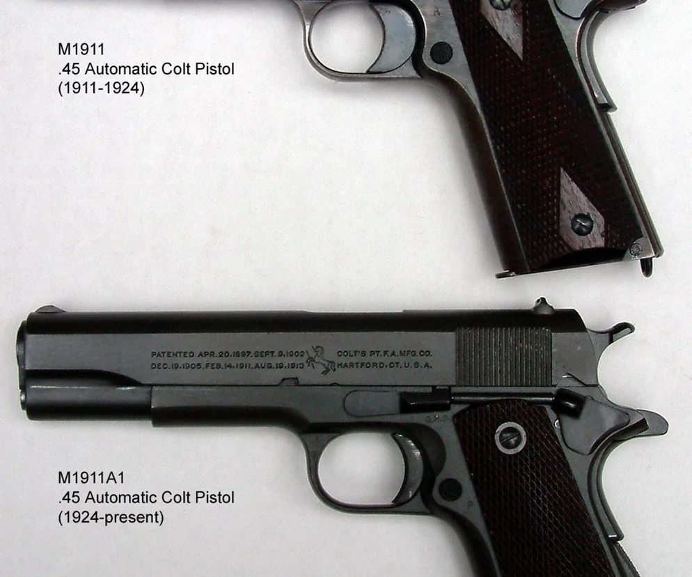 Colt M1911. Pistolet półautomatyczny kal. 11,43 mm (0,45 cala) konstrukcji Johna Browninga — legenda sama w sobie. W powszechnym użyciu w armii amerykańskiej jeszcze w latach 80. XX w., potem zastąpiony przez Berettę M9. Colt M1911 pozostaje jednak na wyposażeniu sił specjalnych Korpusu Piechoty Morskiej pod oznaczeniem M45.