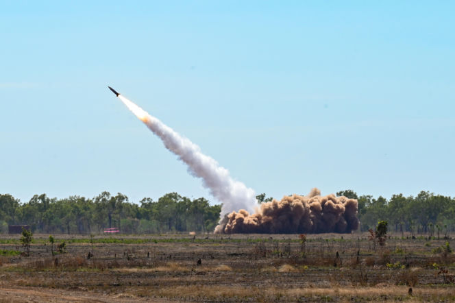 Ciemna rakieta z płonącym, jasnym ogonem dymu i ognia startuje, wznosząc się ukośnie w prawo, w stronę błękitnego nieba. Pod rakietą, w prawym dolnym rogu, widoczna jest struktura wyrzutni oraz duża ilość gęstego, ciemnego dymu, rozprzestrzeniającego się na dole po prawej stronie. Niebo, od góry w lewo, przechodzi od jasnoniebieskiego do jaśniejszego, lekko pomarańczowego odcienia u dołu.